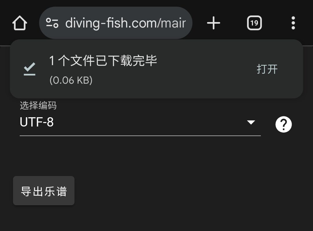 登录水鱼查分器,直接点击下方的导出为 CSV按钮,选择UTF-8,导出,浏览器会自动下载。使用文本编辑器打开即可查看你的成绩。